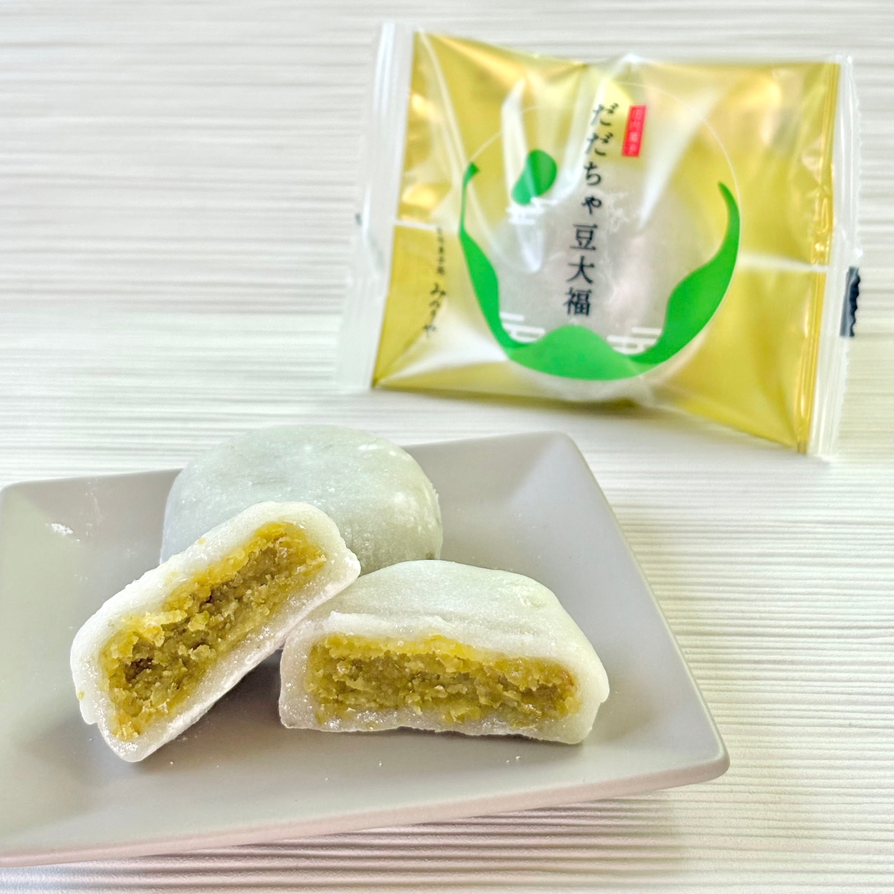 枝豆あん【枝豆(大豆:遺伝子組み換えでない)、砂糖、白生餡、還元麦芽水飴、他】(国内製造)、砂糖、もち粉、水飴/甘味料(トレハロース)、クチナシ色素、乳化剤、酵素、(一部に大豆・乳成分を含む)